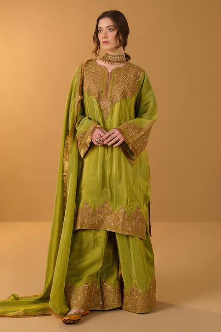 Buy_Tulpalav_Green Tissue Lace, Embroidery Kashmiri Tilla Short Pheran Kurta Palazzo Set_at_Aza_Fashions