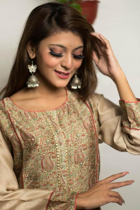 Beige Pure Chanderi Paisley Round Embroidered Kurta