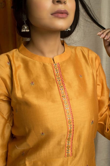 Mustard pure chanderi kurta with zari & resham embroidery. Paired with embroidered dupatta.