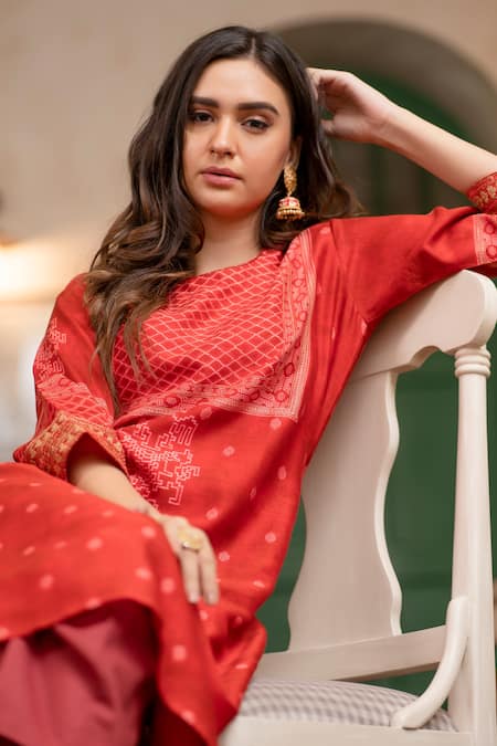 Red printed pure chanderi kurta with zari work on the cuff & round neck.