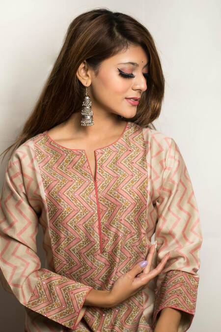 Beige Pure Chanderi Embroidered Chevron Notched Printed Kurta