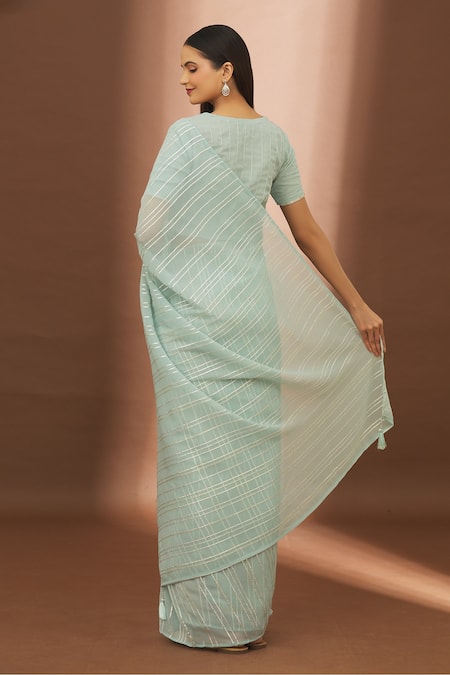 Blue saree featuring embroidered gota patti striped pattern. Paired with a cutdana embellished padded blouse.