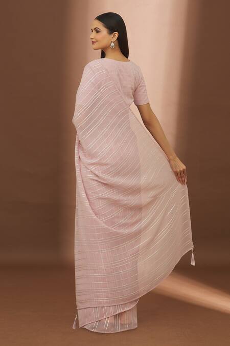 Purple saree featuring embroidered gota patti lace striped pattern. Paired with a cutdana embellished padded blouse.