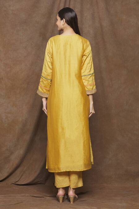 Mustard yellow pure chanderi kurta with an embroidered yoke and cuffs. Comes with palazzo & dupatta.