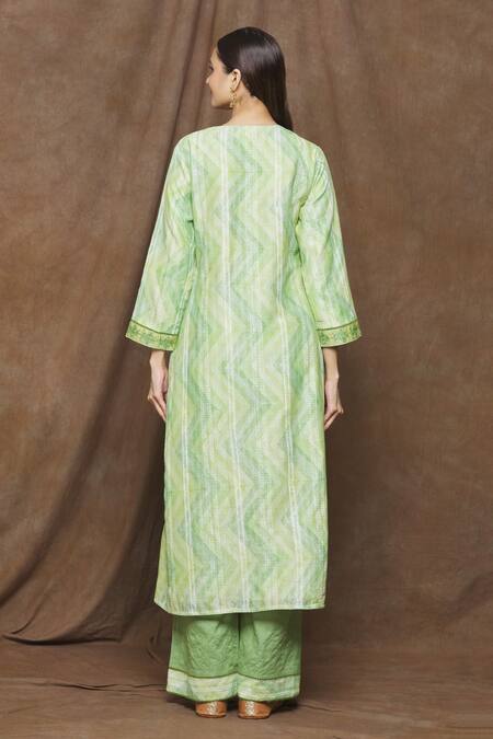Green pure chanderi printed kurta with an embroidered placket. Comes with palazzo & dupatta.