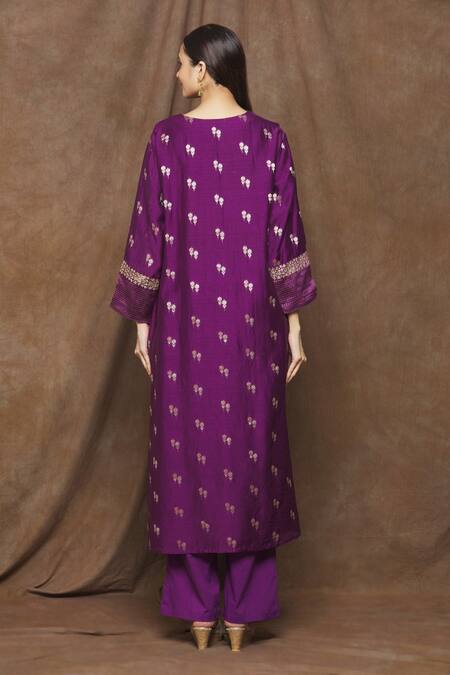 Purple banarasi woven chanderi kurta with all-over zari buttis & zari embroidery on the neckline. Comes with palazzo & dupatta.