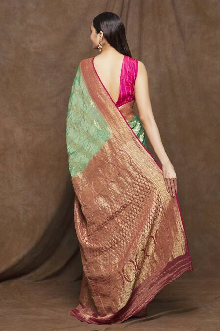 Green pure georgette tissue saree with gold floral zari work across the sari and a contrasting border. Comes with a running blouse fabric.
