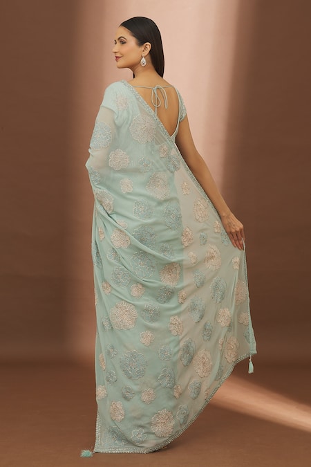 Pastel blue saree featuring resham embroidered floral motifs highlighted with sequin embellishments. Paired with a sequin striped padded blouse with a scooped back and back tasselled tie drawcord.