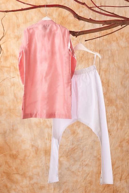 Pink kurta featuring multi-color bead embroidered placket and asymmetric pintucked layered panel. Paired with a contrast straight pant with an elasticated waistband.