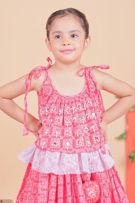 Red Cotton, Tassels, Hand Embroidered Ruffled Top And Lehenga Set