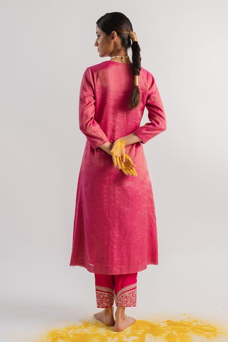 Pink tissue A-line kurta featuring a round neckline and three-quarter sleeves. Paired with a hand embroidered slub silk salwar adorned with bead work.