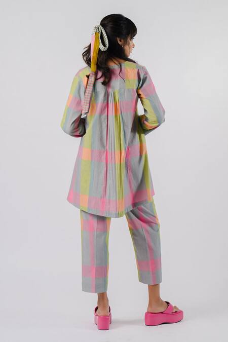 Grey cotton tunic featuring an all-over multi color checkered print and full sleeves. Paired with matching printed straight fit pants.