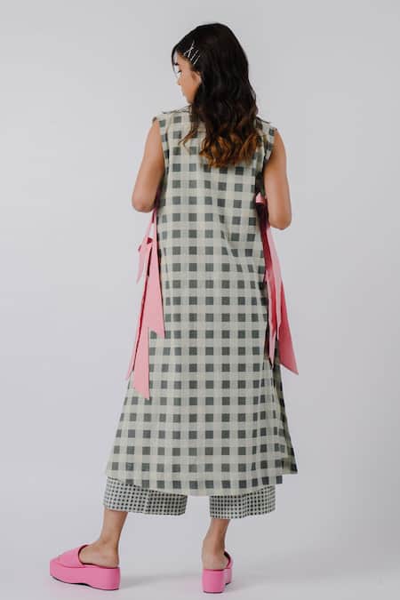 Black Cotton Bows Round Neck Chequered Pattern Jacket