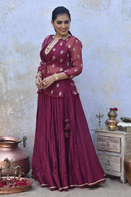 Maroon Spun Silk Hand Embroidered Sequins Round Jacket Lehenga Set