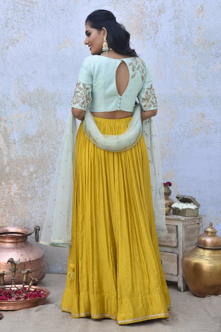 Yellow spun silk lehenga featuring an attached cancan and pleats. Paired with a sky blue raw silk padded blouse adorned with beaded hand embroidery and a net dupatta.