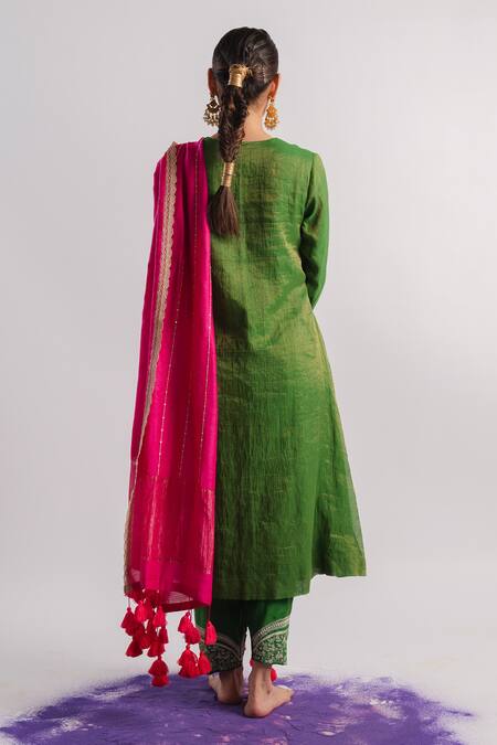 Green tissue A-line kurta featuring a V neck and three-quarter sleeves. Paired with hand embroidered slub silk salwar with sequins and embroidered hem.