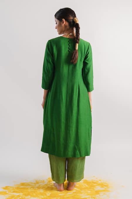 Green Kurta Slub Silk Hand Embroidered Neck A-line And Pant Set
