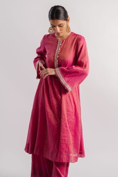 Pink tissue A-line kurta featuring a round neckline, flared sleeves, and sequins hand embroidery on the placket and sleeve hems. Paired with a straight pant, the kurta also showcases small coin detailing.