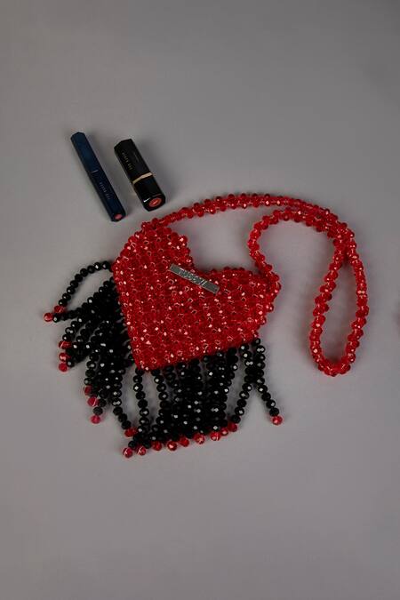 Red heart-shaped mini bag adorned with high-quality crystals and contrasting black crystal fringes