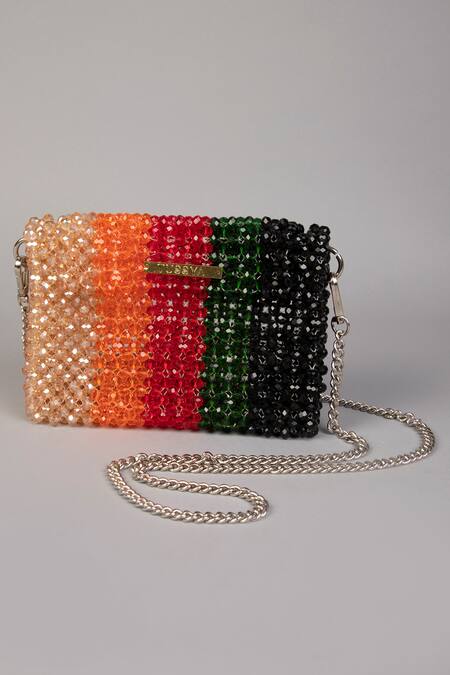 Multi color handbag adorned with high-quality crystals in contrasting hues. Features a detachable silver sling chain for versatile carrying options.