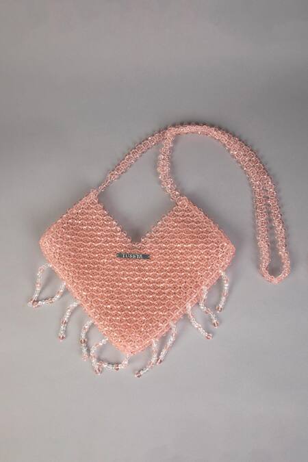 Heart-shaped bag adorned with baby pink crystals featuring a woven crystal belt and fringes made of crystal beads