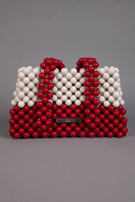 Cherry Ivory bag featuring an intricate design of woven pearls with a versatile color-blocking scheme