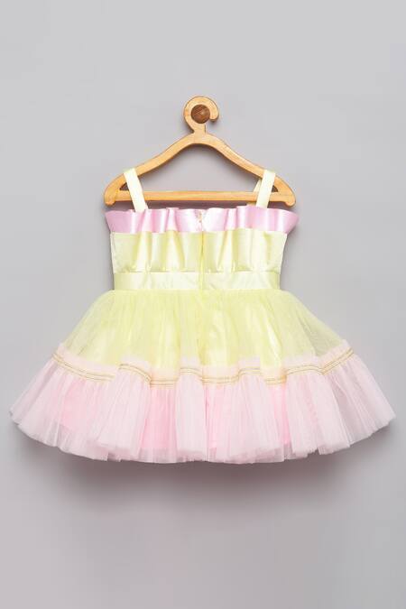 Yellow and pink dress featuring a straight neckline, sleeveless design, and 3D pleated yoke