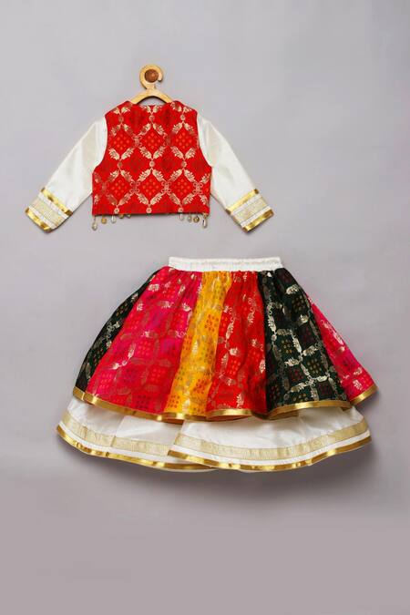 Multi color angarkha crop top featuring a V-neck and full sleeves with front press buttons. Paired with a kali lehenga made of brocade with a plain layering detail and attached inner lining.