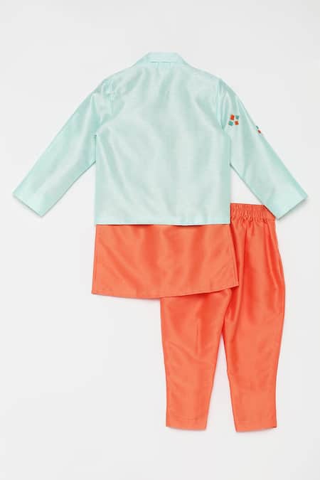 Mint blazer featuring geometric embroidery, lapel collar & full sleeves. Paired with a peach kurta and elasticated waist pyjama.