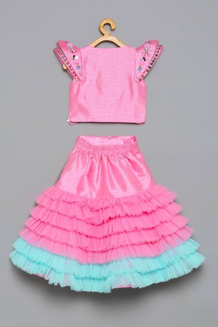 Pink fish cut lehenga featuring attached can can with soft tulle pleated ruffle layers. Paired with a raw silk angarkha style blouse adorned with intricate hand embroidery in beads and sequins.