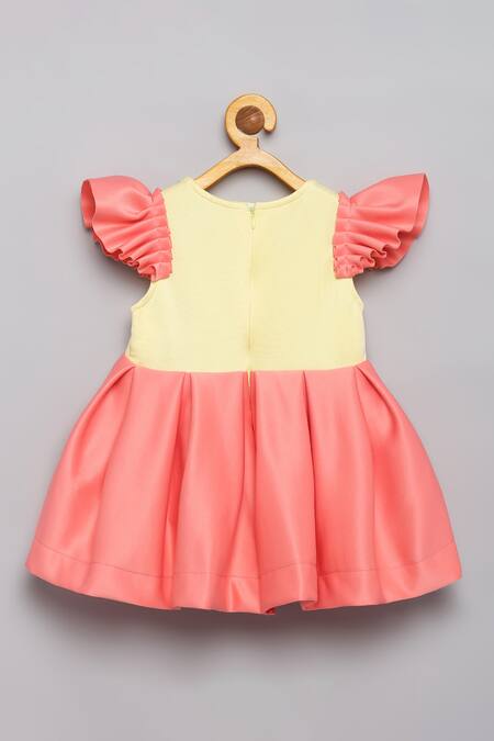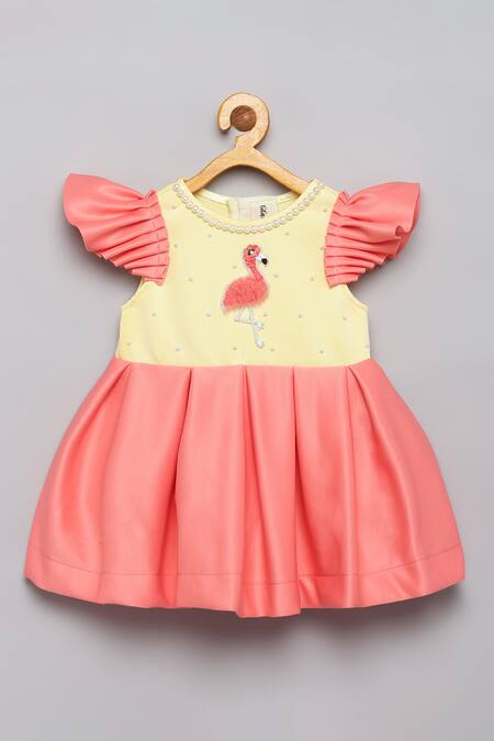 Yellow and peach fit and flare dress featuring pearls and flamingo embroidery