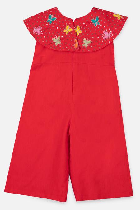 Red Cotton Embroidery, Sequins Organic Jumpsuit