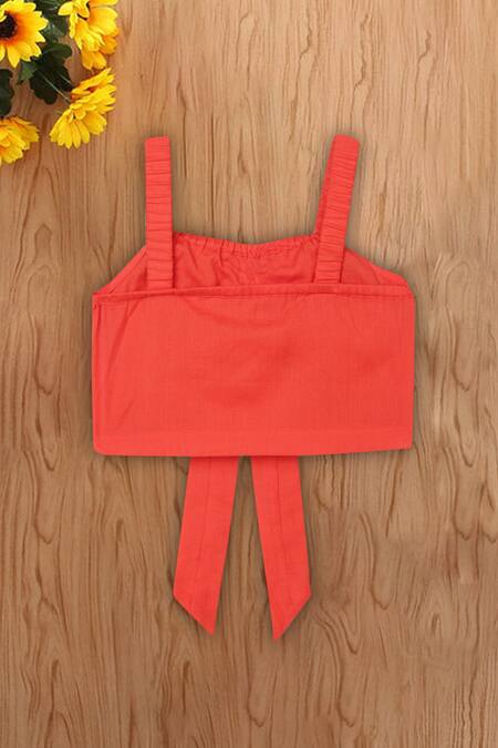 Coral top with front-bow. Paired with printed motifs shorts & mask.