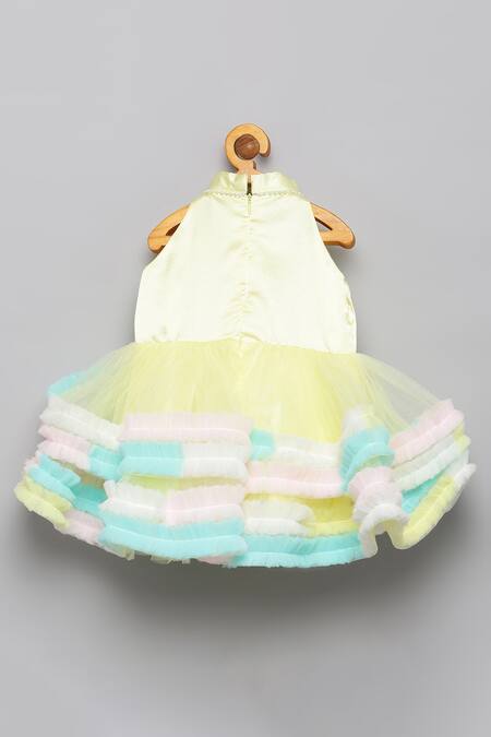 Yellow Satins Embroidered Sequin Placed Butterfly Applique Pattern Frill Dress