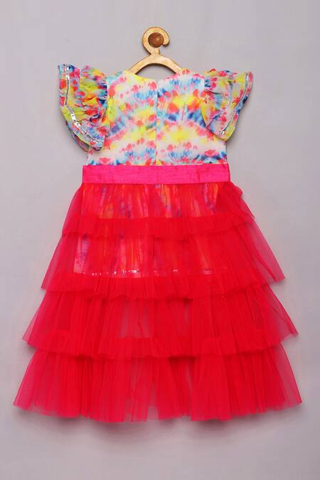 Multi color tie dye dress featuring embroidered mirror work at the front neck and a cut-out on the front waist. Paired with a pink detachable tiered trail made of soft tulle.