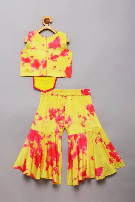 Yellow and pink tie dye top featuring embroidered mirror work on the front. Paired with a matching sharara that has metallic lace detailing on the waist belt.