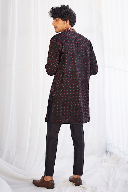 Black kurta with bandhani print and mirror embroidery on the collar and cuffs. Comes with straight pants.
