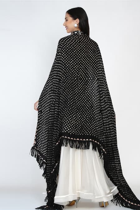 Black cape with crushed bandhani design and mirror embellishments.