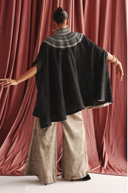 Black crushed raidana silk bandhani cape featuring slit sleeves and marodi embroidered neck yoke. Paired with coordinating palazzo pants.