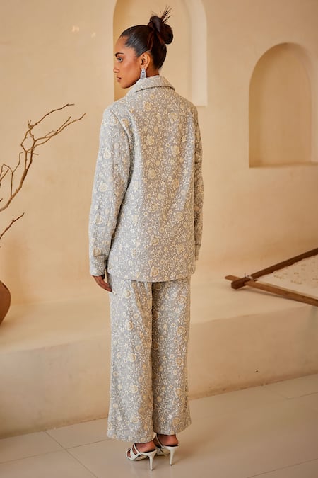Grey coat featuring full sleeves and notched lapel collar with chikankari hand embroidery