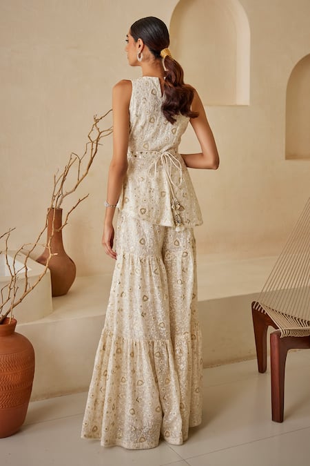 White peplum top featuring all over chikankari embroidered floral motifs with sequin embellishments. Comes with a matching belt.