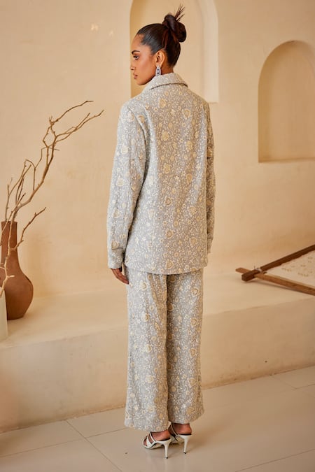 Grey straight pant featuring all-over floral chikankari and sequin work