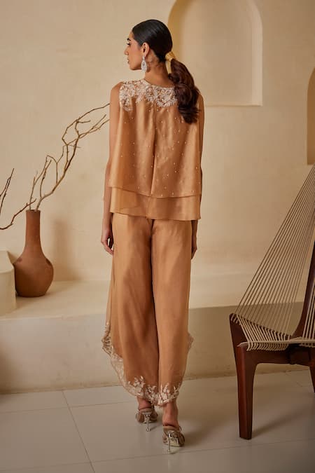 Beige Organza Embroidery Round Neck Floral Parsi Layered Top
