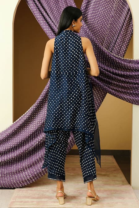 Blue cape with bandhani tie & dye work, sheer hem panels, zipper details & cherry blossom placement motif.