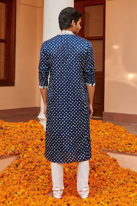 Blue kurta with bandhani dyed motifs, front buttons & mirror work.
