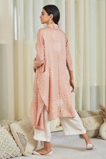 Peach long overlay in gajji silk hand tie dyed bandhani pattern. Paired with bustier & pant.