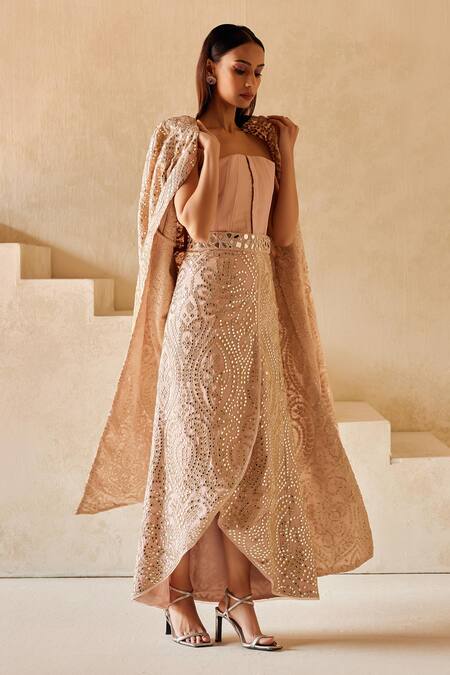Intricate mirror work detailing on all components, Open jacket with cape sleeves, Corset top with structured fit