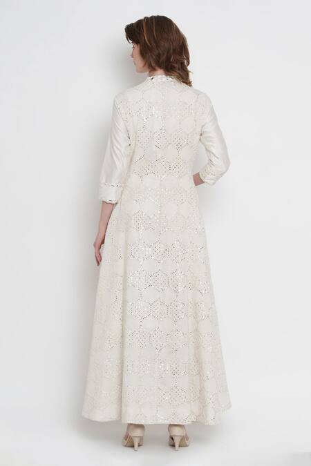 White Georgette Lucknowi Mirror Work Band Embellished Jacket