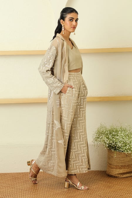 Beige bell bottom pant in georgette base with mirror embroidery in chevron pattern.