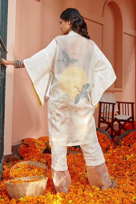Off-white pant in georgette base with hand embroidered mirror work in striped pattern & organza sheer panels.